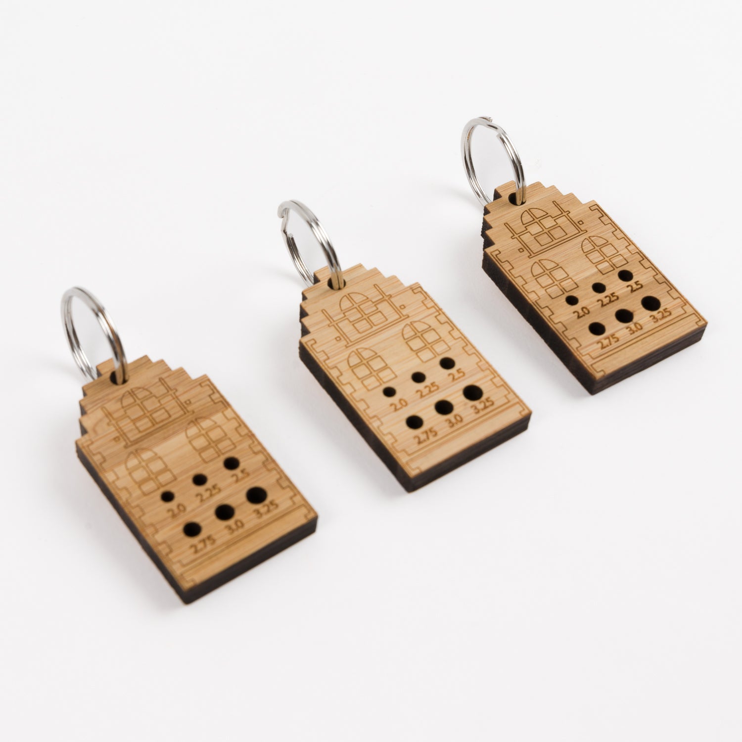 A helpful little tribute to the city of Amsterdam, these little keychains styled like canal houses double as needle gauges. The gauge has millimeter sizes 2.0, 2.25, 2.5, 2.75, 3.0, and 3.25. Perfect for sock knitters and those who like smaller needles!