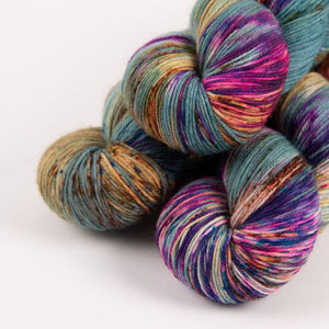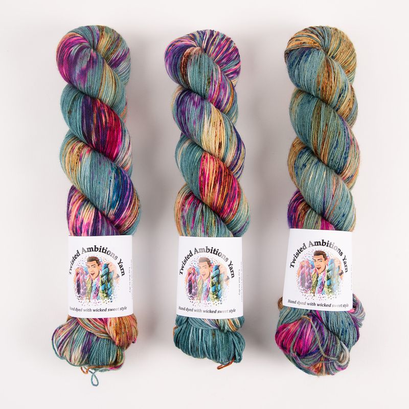 Knit a show stopping pair of socks with this gorgeous fingering weight yarn from Twisted Ambitions!