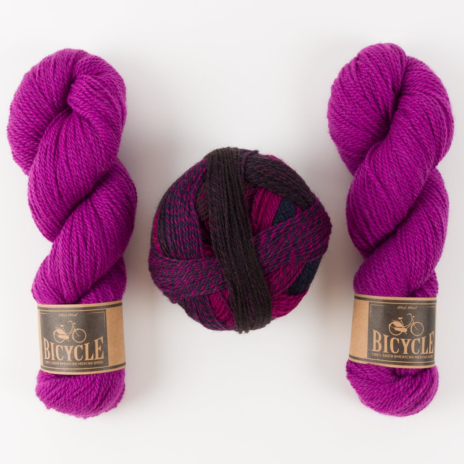 This dynamic duo contains two stunning solid skeins of West Wool and a self-striping contrast from Schoppel-Wolle, both in fingering weight yarn. If you need inspiration, it can be used to knit any of these Westknits Patterns.