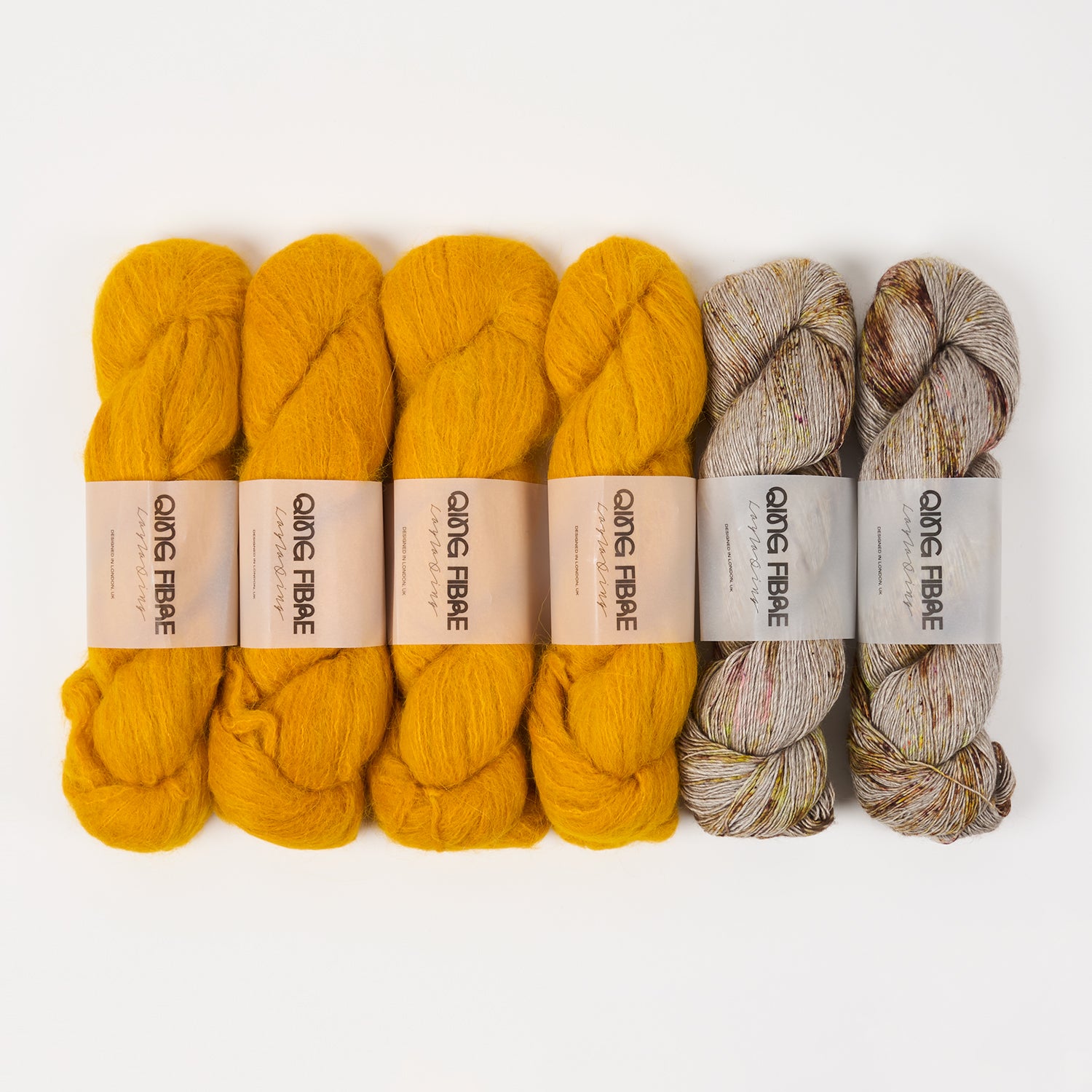 This stunning kit fromQing Fibre has a fingering weight yarn and a beautifully soft and fluffy contrast.