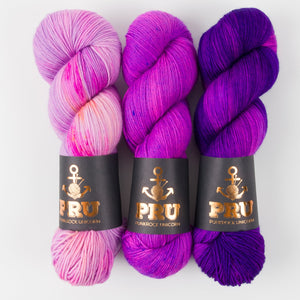 This gorgeous kit from Punk Rock Unicorn contains three skeins of fingering weight yarn. If you need inspiration, it can be used to knit any of these Westknits shawls.