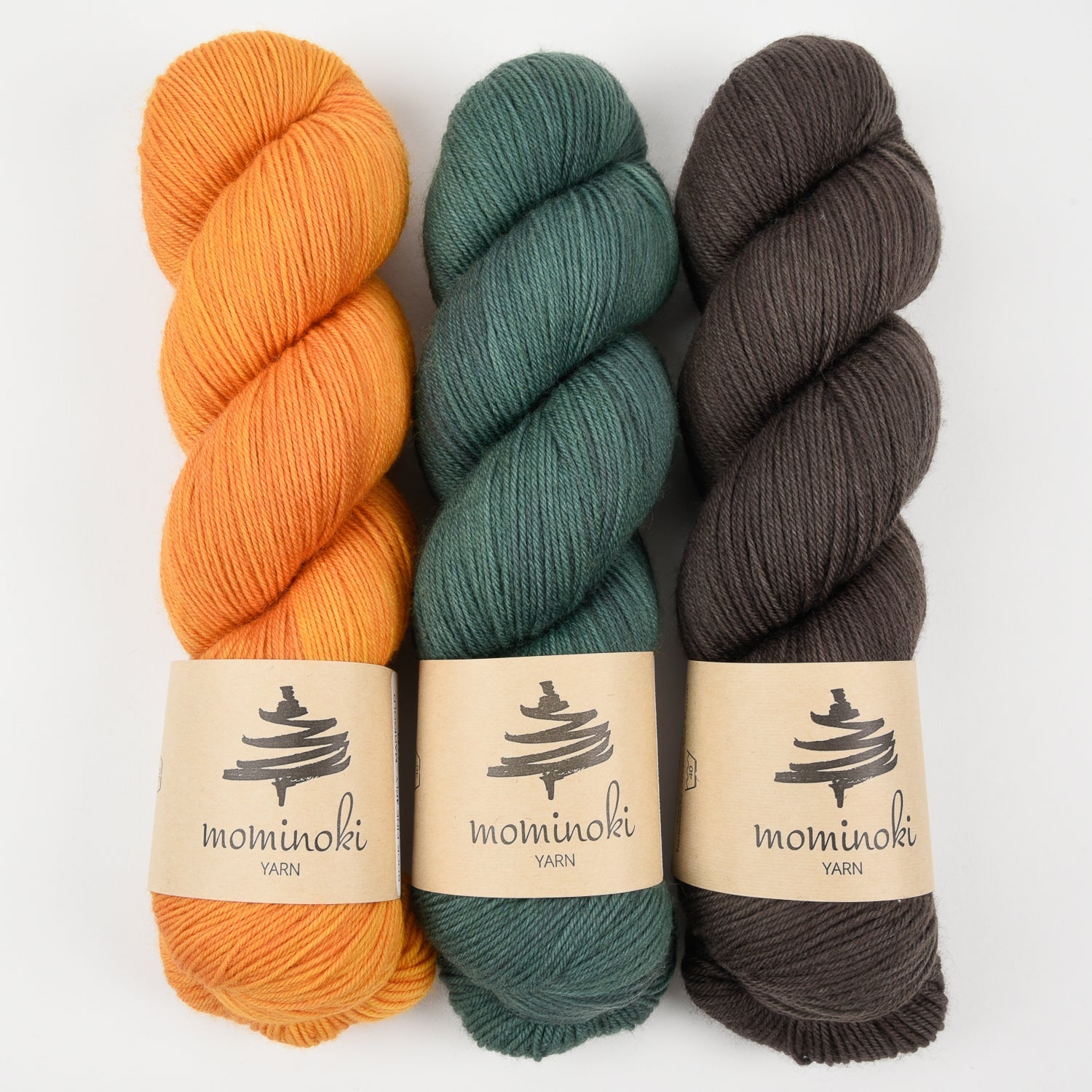 This gorgeous kit from Mominoki Yarn contains three skeins of fingering weight yarn. If you need inspiration, it can be used to knit any of these Westknits shawls.